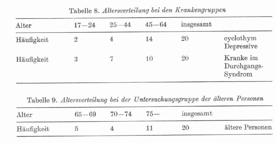 Bei der Überprüfung der Alters- und Krankheitsabhängigkeit des MWT beschränkten wir uns auf eine Gruppe betagter Versuchspersonen' sowie zwei Gruppen von Kranken mit einer Psychose, und zwar, wie schon gesagt, einer cyclothymen Depression' oder einem Durchgangs-Syndrom nach Wieck. Jede Gruppe umfaßt 20 Probanden. Die alten Personen fanden wir in einem Altersheim für Wohlsituierte. Die Tab. 8 und 9 geben eine Übersicht über die Altersverteilung in den drei Gruppen.