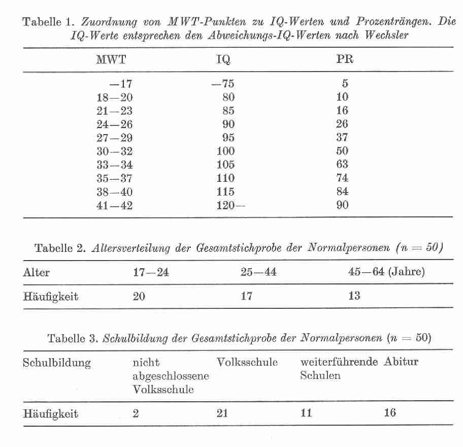 Die Differenz betrug bei den Kranken mit einer zyklothymen Depression durchschnittlich 12,5 IQ-Punkte und bei den Kranken mit einem Durchgangs-Syndrom durchschnittlich 13,5 IQ-Punkte. Unterstellt man, daß höheres Alter und psychische Krankheiten die intellektuelle Leistungsfähigkeit nur zu beeinträchtigen, nicht jedoch zu bessern vermögen, so ist aus diesem Verhalten zu schließen, daß der MWT noch deutlich alters- und krankheitsunabhängiger ist als der WT.