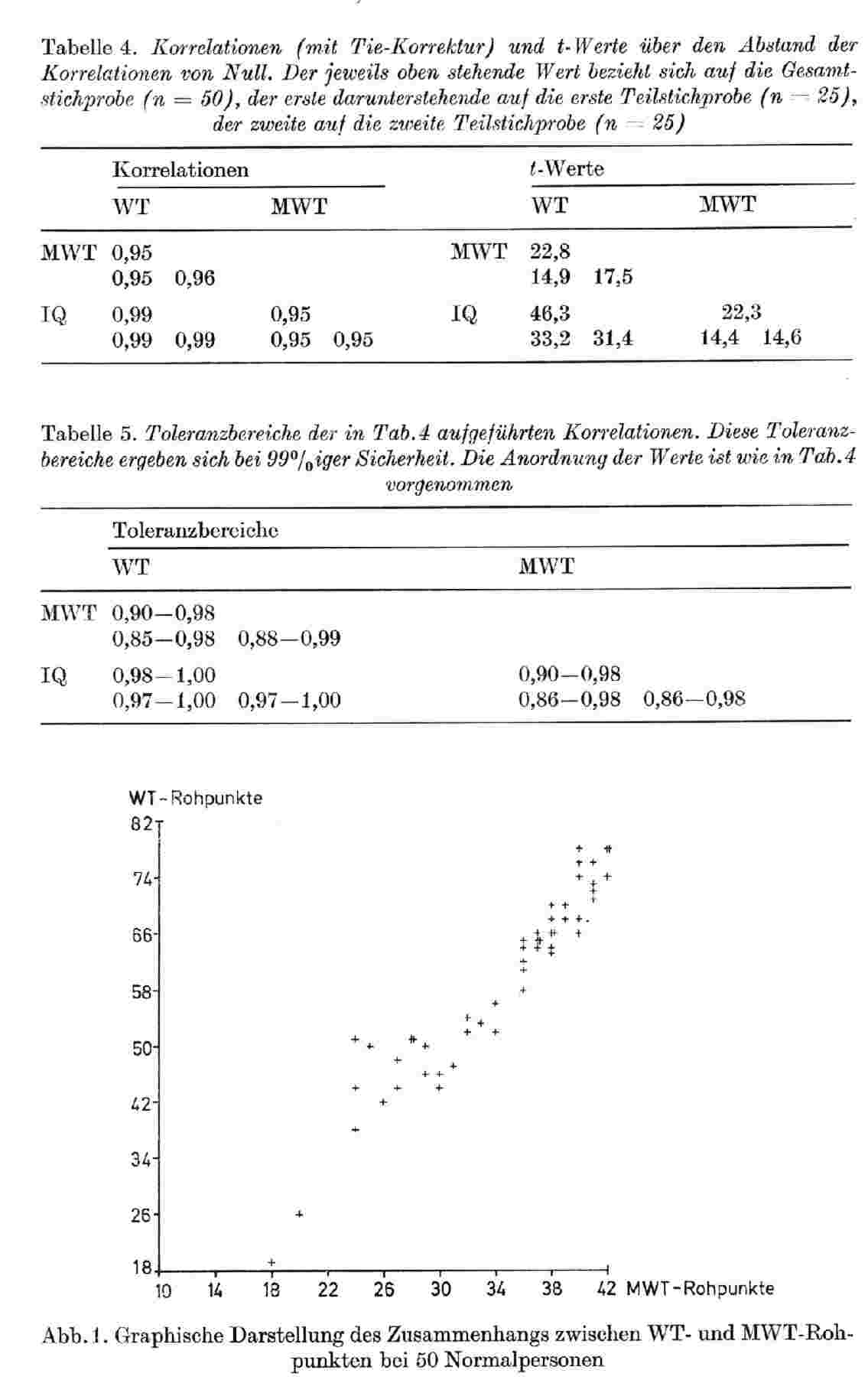 Bei sämtlichen Stichproben - der Gesamtstichprobe und den beiden Unterstichproben - korrelierten wir die Variablen: Rohwerte des MWT, Rohwerte des WT und IQ-Punkte nach dem WT. Die IQ-Punkte aus dem WT mußten errechnet werden, da Angaben über IQ-Werte aus den HAWIE-Subtests in der Literatur fehlen. Bei der Berechnung haben wir die Intention Wechslers zugrunde gelegt, daß für alle Subtests 10 Wertpunkte einen Mittelwert darstellen und 3 Wertpunkte die Standardabweichung. Beim WT ist diese Absicht, wie die Untersuchungen Wechslers ergeben haben, und wie auch aus von Margaret u. Wright mitgeteilten Ergebnissen zu entnehmen ist, fast ideal verwirklicht worden. Wechsler fand bei 1300 Erwachsenen für den WT einen Mittelwert von 10,1 und eine Standardabweichung von 3,2, während 40 Kontrollpersonen von Margaret u. Wright im WT einen Mittelwert von 9,8 und eine Standardabweichung von 3,2 hatten. In der Tab. 4 sind die gewonnenen Interkorrelationen zwischen den Rohwerten des MWT sowie den Rohwerten und IQ-Punkten des WT niedergelegt. Dabei geben die neben den Korrelationen angeführten t-Werte die Sicherheit an, mit der die Korrelationen als von Null verschieden angenommen werden können. Ein t-Wert von mindestens 2,68 bei der Stichprobe mit n = 50 und ein t-Wert von mindestens 2,80 bei den Stichproben mit n = 25 bedeuten: auf dem 1%- Niveau signifikant von Null verschieden. Über die Toleranzbereiche der in Tab. 4 aufgeführten Korrelationen unterrichtet die Tab. 5.