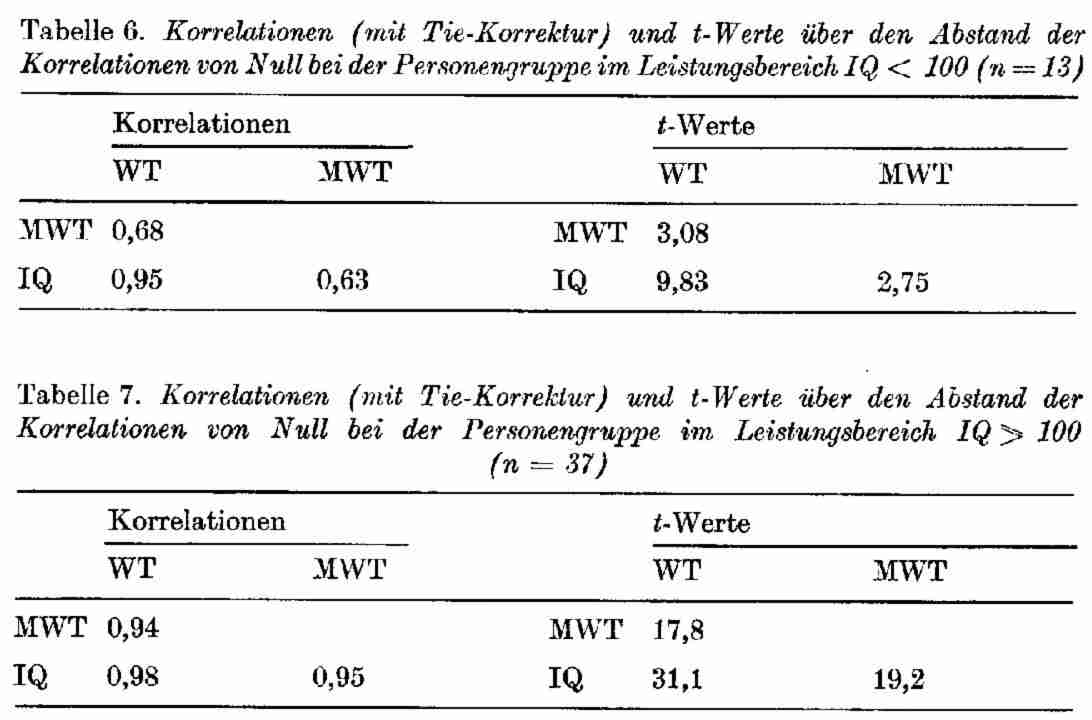 Wegen der asymmetrischen Verteilung und der geringen Zahl der Versuchspersonen ist es besonders wichtig, die Zuverlässigkeit der Ergebnisse mit zu erfassen. Wir haben daher die Versuchspersonenstichprobe in zwei Unterstichproben mit je 25 Versuchspersonen geteilt, und zwar die 25 zuerst untersuchten und deren Komplement, mit dem Ziel, die getrennt gewonnenen Ergebnisse auf Übereinstimmung zu prüfen. Da die Versuchspersonenstichprobe keine Normalverteilung aufweist und die Zusammenhänge von WT und MWT nicht von vornherein rectilinear sein müssen, wurde außerdem für die Korrelations- berechnungen der Spearmansche Korrelationskoeffizient "rho" gewählt.