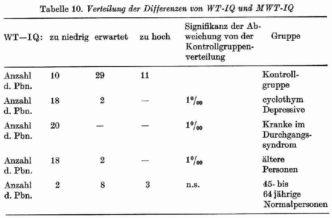 Im Einzelnen fanden wir, wie in der Tab.10 zusammengestellt ist, bei den alten Personen und bei den Kranken mit einer zyklothymen Depression in jeweils 18 Fällen den aus dem MWT-Ergebnis errechneten Erwartungswert höher als den direkten WT-1Q. Bei den Kranken mit einem Durchgangs-Syndrom war die Differenz zuungunsten des WT-Ergebnisses sogar in allen Fällen nachweisbar. Zum Vergleich enthält die Tab. 10 die Verteilung der IQ-Differenzen bei der Normalgruppe und, da bei den Gruppen der kranken Versuchspersonen die Altersklasse 45-64 Jahre überwiegt und die Differenzen zwischen den beiden IQ-Werten ein Alterseffekt sein könnten, gesondert die Verteilung der IQ-Differenzen bei dieser Altersklasse der Normalpersonen. Sämtliche Differenzen zwischen den Versuchsgruppen und der Kontrollgruppe sind auf dem 1-Promille Signifikanzniveau statistisch gesichert.